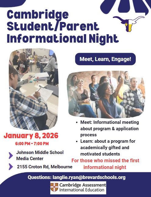 The Cambridge Program at Johnson Middle School strives to prepare students for a rigorous course of study at whichever high school they plan to attend. Primarily our students continue into the Cambridge AICE Program at Eau Gallie High School.