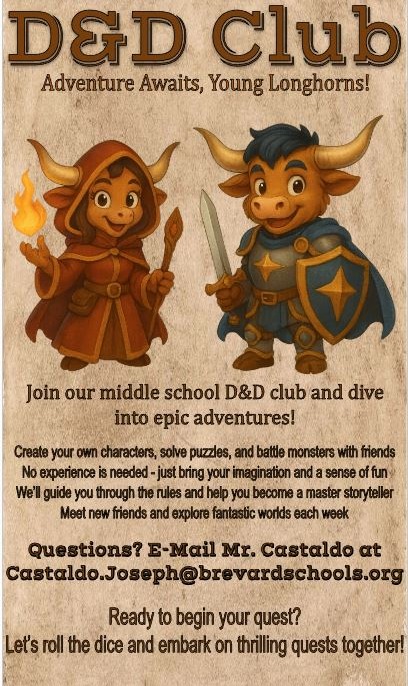 Join the Johnson Middle School D&D Club and dive into epic adventures! Create your own characters, solve puzzles, and battle monsters with friends. No experience is needed - just bring your imagination and a sense of fun. We’ll guide you through the rules and help you become a master storyteller. Meet new friends and explore fantastic worlds. Let’s roll the dice and embark on thrilling quests together!